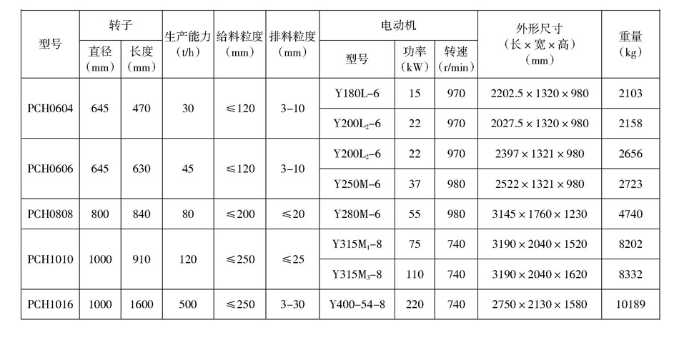 2.破碎機(PCH0808除外)均有兩種型號電機供選牌,請選用時注明。